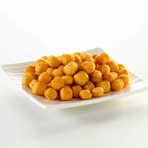Ingrédients: Boules de soja soufflées (protéines de soja, farine de riz, semoule de maïs, sel, sucre, extrait de levure), protéines de lait, huile de tournesol, agents d’enrobage: gomme arabique, résine de shellac, sel, arômes, colorant: curcumine.